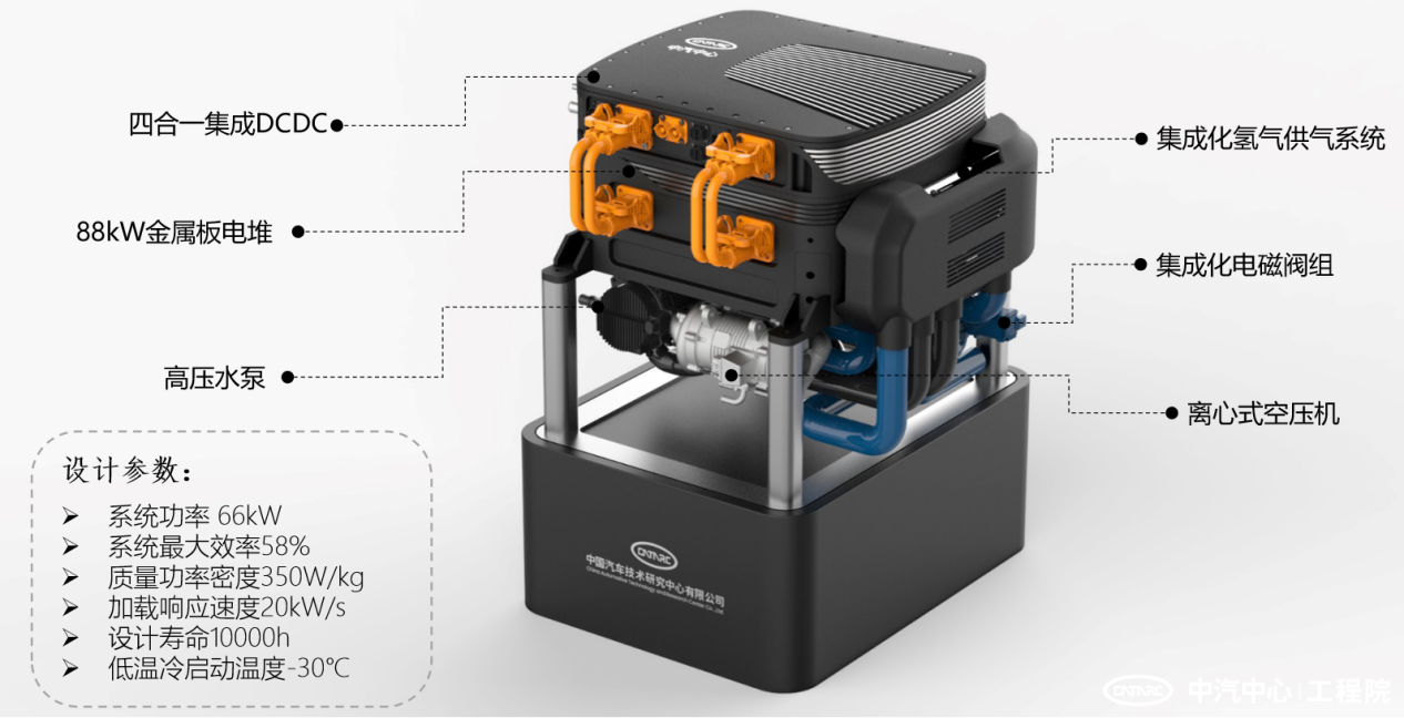 中汽中心工程院依托自身在新能源汽車和電子電控技術領域的優勢,自主設計開發了燃料電池發動機,一級零部件國產化率100%,系統最大效率達到58%,系統質量功率密度達到350W/kg,發動機展現出優異的冷啟動表現,成功實現-30℃低溫冷啟動,相關技術指標達到國內領先水平。