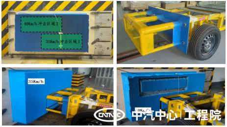 為使壁障非標工況沖擊試驗更接近整車碰撞工況,沖擊器的設計參考車輛典型結(jié)構(gòu)布置形式、結(jié)構(gòu)參數(shù)與質(zhì)量數(shù)據(jù)。沖擊速度采用整車工況標準速度35Km/h,同時增加40Km/h的沖擊速度試驗,該速度測試能夠充分反映蜂窩鋁在觸底狀態(tài)下的力學特性,更精確的模擬結(jié)構(gòu)強度較大的車型,擊穿蜂窩鋁后撞擊到剛性墻的變形情況。