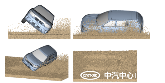 傳統車輛涉沙性能開發,依賴多樣車、多輪次的試驗驗證,不僅費用高昂,也存在一定的安全風險。為解決這一難題,中汽中心工程院安全開發團隊研究了沙粒特性參數,創新開發了沙坑壁障有限元模型,可高精度模擬離散沙粒的動力學特性,實現對涉沙事故場景的預測與虛擬驗證。