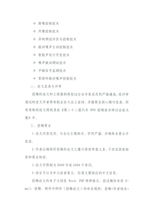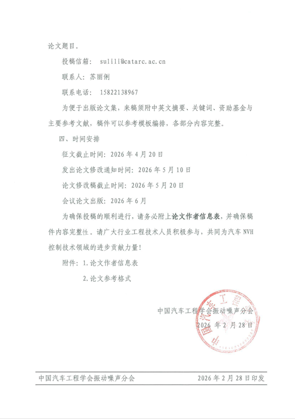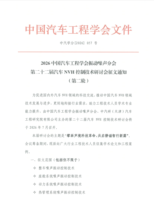 2026中國汽車工程學會振動噪聲分會 第二十二屆汽車NVH控制技術研討會征文啟事 (第二輪)