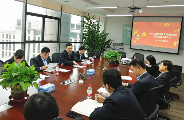 2018年3月15日,汽車工程研究院召開黨風廉政建設和反腐敗工作會議,貫徹落實中汽中心黨風廉政建設和反腐敗工作會議精神及中汽中心紀委2018年工作要點文件要求,部署2018年黨風廉政建設和反腐敗工作任務。工程院黨總支書記、黨總支委員及各部門副科級以上領導干部參加會議,會議由黨總支副書記馬杰主持。